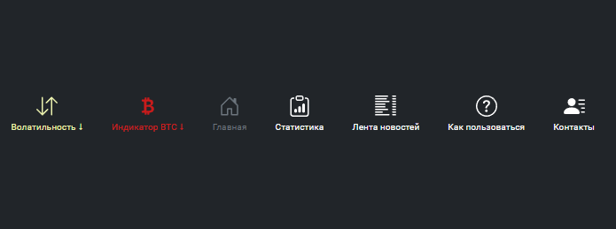 На главной панели вы видите все инструменты, которые торгуются на фьючерсах в Binance, индикатор Биткоина, индикатор Волатильности и другие разделы сайта.