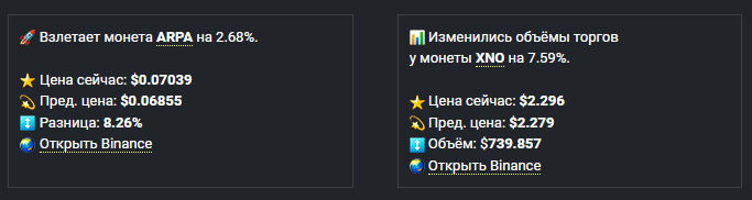 Каждую минуту ScalpVision проверяет все токены представленные на Binance и публикует в разделе важные изменения, которые произошли с токеном. Резко повысились объёмы, изменилась цена и так далее. Данная информация может помочь в аналитике и дальнейшем принятии решения для входа в сделку.