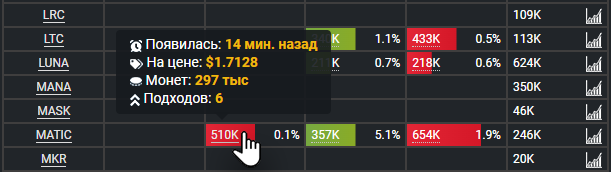 При наведении курсора мыши на Тикер токена, Вы получите подробную информацию по монете на бирже Binance.