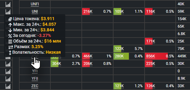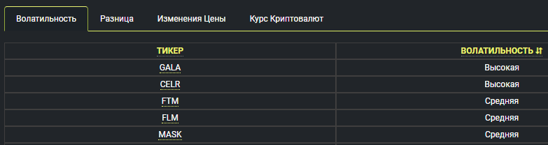 ВОЛАТИЛЬНОСТЬ - Список токенов отсортированных по волатильности монеты. Чем выше монета в списке, тем больше движений по цене.