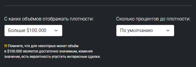 С КАКИХ ОБЪЁМОВ - Показывать плотности на бирже. Будьте внимательны, для некоторых монет и $100.000 будет являться значимой суммой.